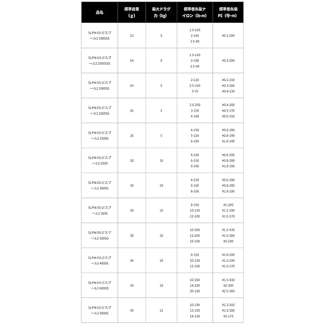 標準巻糸量 ナイロンライン: 4.0lb-150m, 5.0lb-120m, 6.0lb-100m