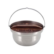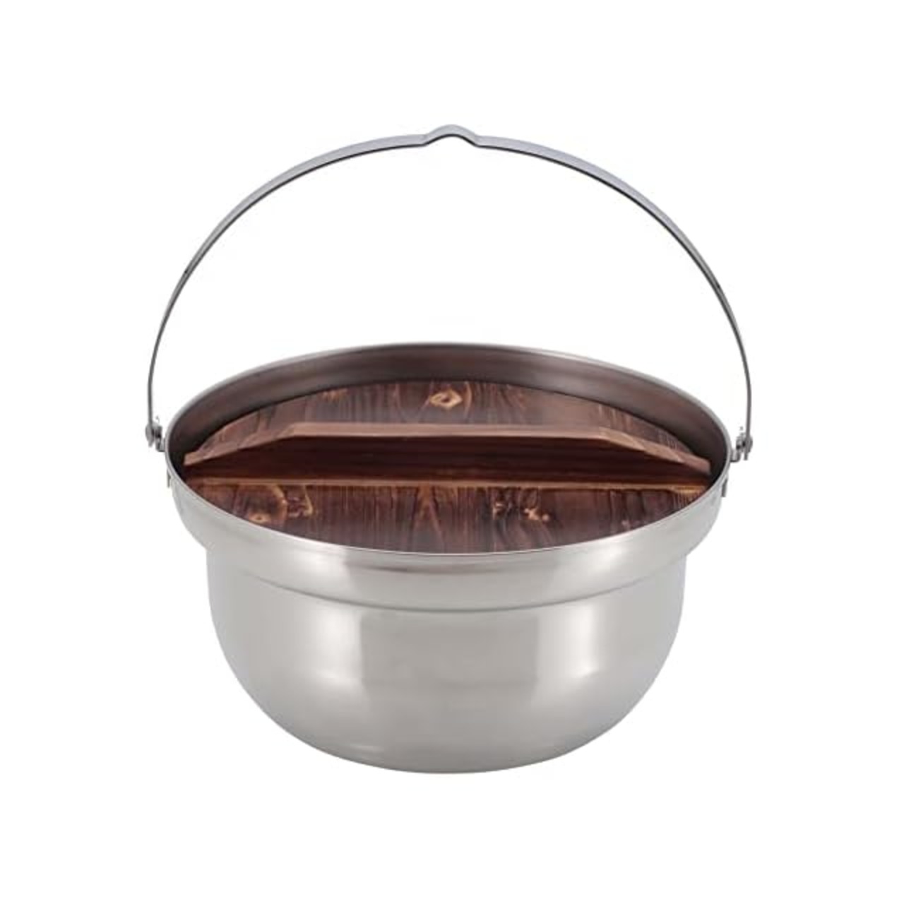 材質:鍋/ステンレス鋼(クロム18%、ニッケル8%)(底の厚さ0.5mm)、ハンドル・金具/ステンレス鋼、木蓋/天然木、原産国:本体焚火鍋/日本、木蓋/中国