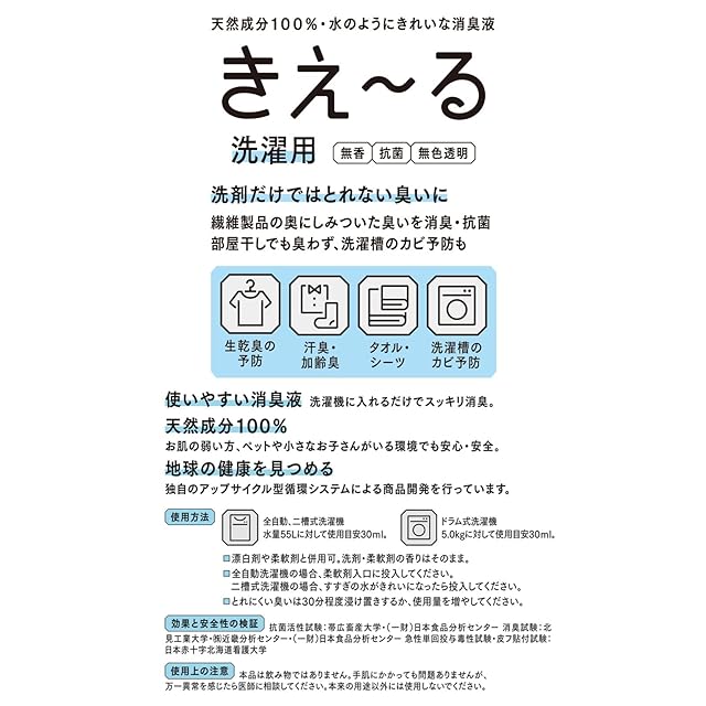 商品名:環境ダイゼン 消臭剤 洗濯用 衣類用 1L 無香料 きえ~る 善玉活性水 加齢臭や部屋干しのニオイを消臭 洗剤と一緒に入れるだけ 1本入 単品 1個