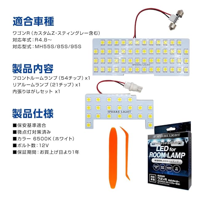 セット内容:フロントルームランプ(54チップ)×1、リアルームランプ(21チップ)×1、内張りはがしセット ×1