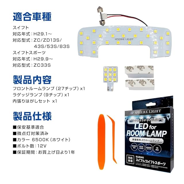 商品名:スフィアライト スイフト スポーツ LED ルームランプ セット ホワイト ZC ZD13S 43S 53S 83S ZC33S 専用設計 室内灯 取付 簡単 微点灯 点滅 対策 SPHERELIGHT SLRM-42