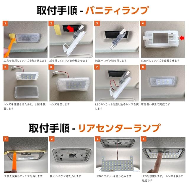 【専用工具付きで簡単交換】車体側のルームランプレンズを取り外すための専用工具(内張り剥がし)が付属しているため、取り外しづらいランプレンズも簡単に取ることができ、純正ランプと交換するだけの楽々交換。作業時間も短縮し、LED初心者さんをしっかりサポートします。