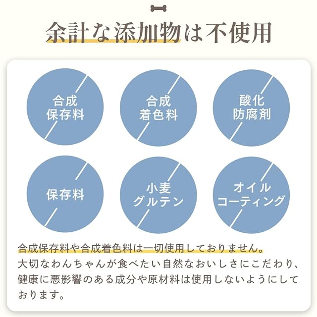 合成保存料・調味料・着色料・香料・防腐剤不使用。涙やけの原因になりやすいオイルコーティングは使用せず、「カツオ節」の風味で食いつきを強化しました。