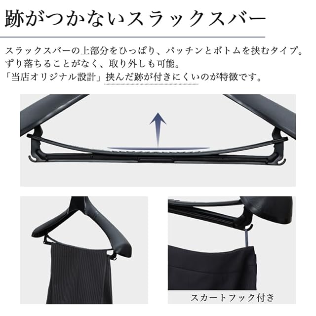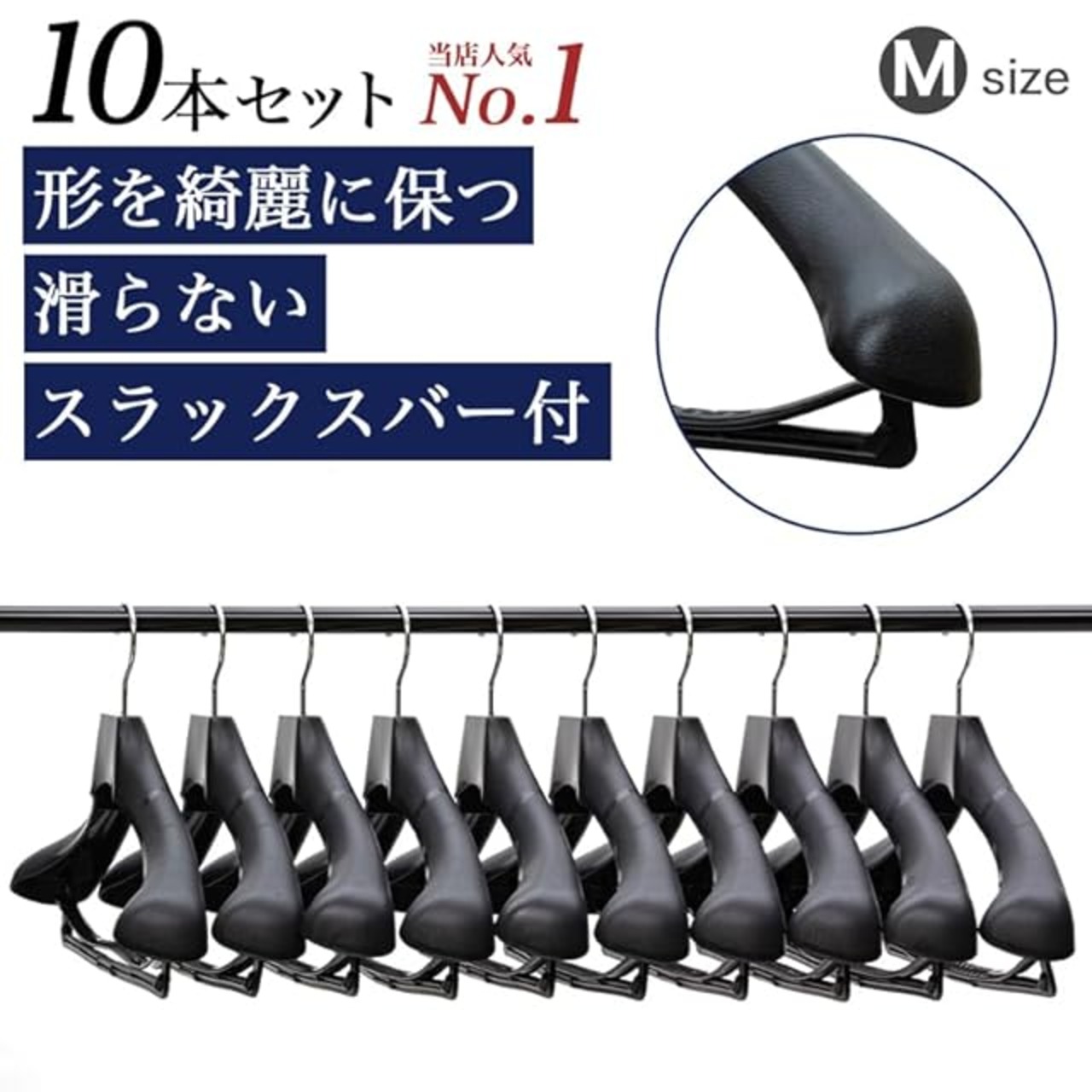 肩ラインの形状、スラックスバーにこだわり抜いた、大手アパレルメーカー様、老舗テーラー様に長年ご愛用頂いているオリジナルハンガーを10本セットでお届けします。スーツだけでなく、ワンピース、コート、ジャケット、ニット製品、制服等の形をきれいに保ちます。