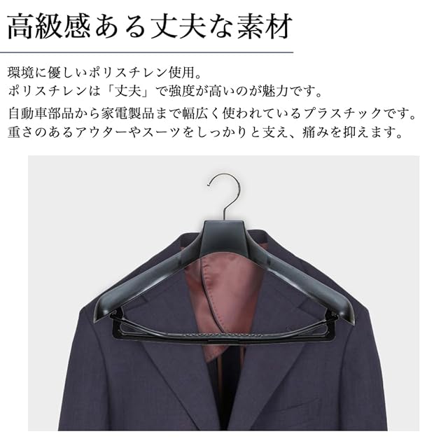 【商品説明】shop用としてロングセラーの実績を持つプラスティックハンガーです。某有名アパレルメーカー様と何度も打ち合わせて設計されたデザインは服の型崩れを防ぐ本格的プロ仕様のハンガーです。