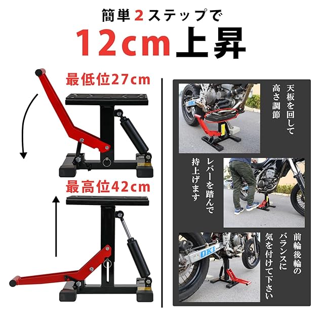 ≪特徴≫ <br> ・オフロードバイク、モタードバイク、トライアルバイクなど車高の高いバイクに対応するダンパー付きのオフロードバイクスタンドです。 <br> ・本体はスチール製 カラーはBLACK 乗り上げ台はゴムラバー付きでバイクを傷つけません。 <br> ・バイクを持ち上げる際、最小限の力で女性でも簡単に持ち上げることができます。! <br> ・また、バイクを下ろす際もダンパーの効果で緩やかに降下させることができるので、バイクに衝撃を与えません。 <br> ・乗り上げ天板自体を回す事によって、高さを調整する事が出来ます。 <br> ・調整した後は天板を固定するホールドピンも付いておりますので安全です。 <br> <p>※車種によっては使用できない場合があります。<br> </p> <p>【仕様】<br> 最低地上高~最高地上高:270~390mm<br> 可動域:100mm<br> 耐荷重:150kg<br> 乗り上げ天板台:170×275(mm)ゴムラバー付き<br> ベースサイズ:310×300(mm)<br> カラー:(本体)ブラック、(キックアーム)レッド<br> 重量:6.5kg<br></p>