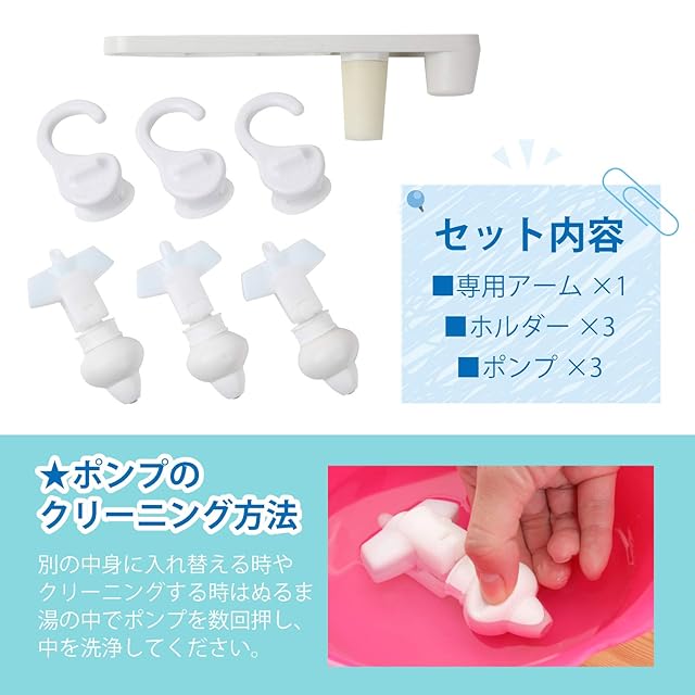 ●詰め替えパックをそのまま使用できるので、ボトル容器は不要 ●詰め替えの手間(洗浄・乾燥・補充)がいらない ●取付、取りはずしは簡単ワンタッチ ●中身は空気にふれない為、最後まで清潔で香りも新鮮 ●バスルームでボトルの置き場所をとらない ●最後まで残らず使える