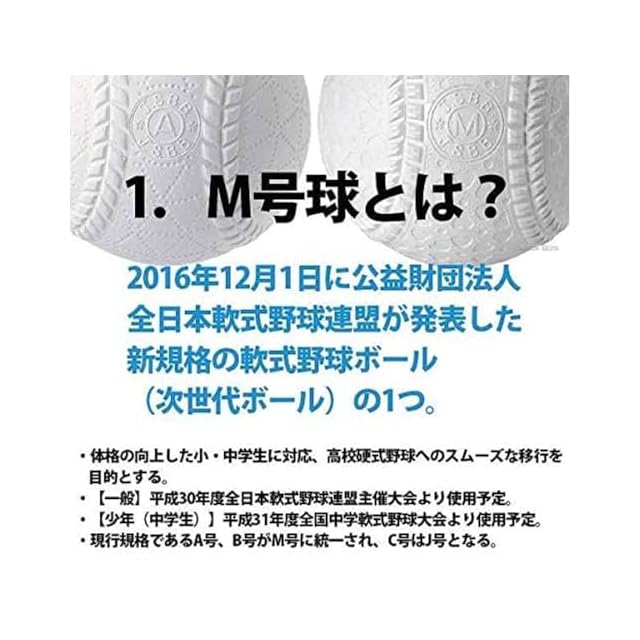 ●軟式用新公認球。M号サイズ。<br> ●メーカー品番:MR-nball-M<br> 中学生の高校硬式野球へのスムーズな移行と、硬球がメインの海外への普及を目的とし新軟式ボールが発表されました。<br>現在の軟式ボールよりわずかに大きく硬くなり、低く弾むため硬式に近い感覚でプレーができるようになります。<br> ※一般軟式は平成30年度全日本軟式野球連盟主催大会より使用予定<br> ※中学軟式は平成31年度全国中学校軟式野球大会より使用予定<br><br>※※およそのサイズ・重量 0×0×0 0g