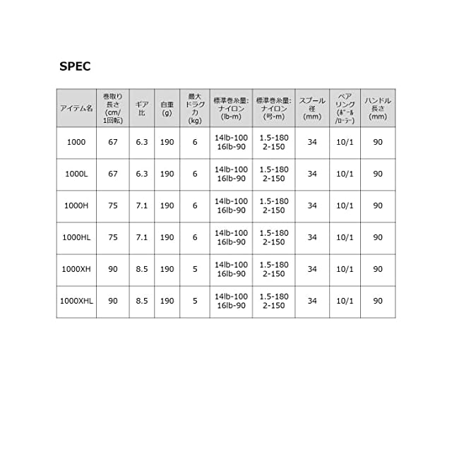 標準糸巻量ナイロン(lb-m): 14-100,16-90
