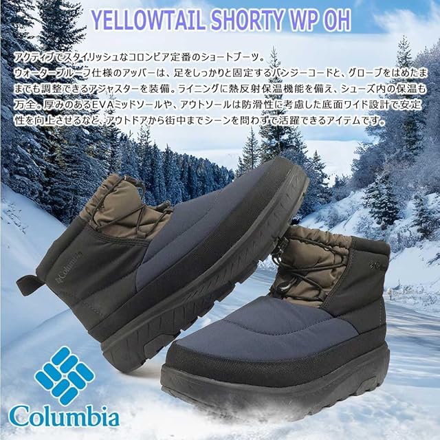 【保温性と快適性を追求した全天候型のショートブーツ】 イエローテイルシリーズ<br/>アクティブでスタイリッシュなコロンビア定番のウィンターシューズのショートブーツ。<br/>アッパーは、ウォータープルーフ仕様で雨天や積雪時も安心です。ライナーに用いた熱反射保温機能「オムニヒートリフレクティブ」のシルバー裏地が、体の熱を利用してシューズ内を暖かく保ちます。足首周りまでしっかりとフィットするバンジーコード仕様で歩行の安定性を確保。さらにグローブをはめたままでも調整が可能なアジャスター付きなのも嬉しいポイントです。<br/>ミッドソールは厚みのあるクッション性の高いソールに仕上げました。アウトソールは軽量性を担保しながら防滑性も発揮する最適なバランスで設計。<br/>汎用性の高いショート丈デザインは、真冬のアウトドアシーンをはじめ、タウンユースとマルチに活躍します。<br/> [素材]ポリエステル、コーデュラファブリック(ナイロン) [サイズ展開]23.0cm / 24.0cm / 25.0cm / 26.0cm / 27.0cm / 28.0cm / 29.0cm