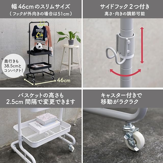 山善(YAMAZEN) ワゴン ハンガーラック トローリーハンガー スリム キャスター付き (高さ4段階調節/バスケット2つ付き/全体耐荷重27kg) 幅51×奥行38.5×高さ113.5/139/164.5/189cm 衣類収納 組立品 ブラック LTHS-2(BK) | emishop315