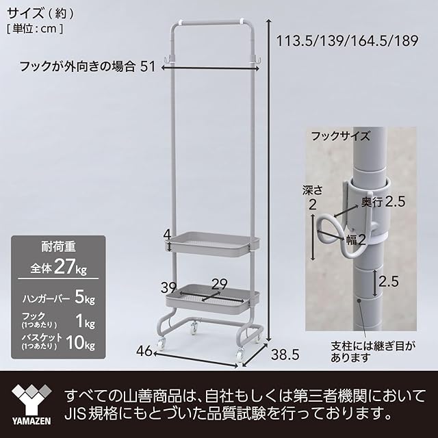 ●本体サイズ(約):幅51×奥行38.5×高さ113.5/139/164.5/189cm(高さは4段階で調節可能)●全体耐荷重 : 27kg(ハンガーバー上段 : 5kg、バスケット1個あたり: 10kg、フック1個あたり: 1kg)●構造部材 : フレーム、バスケット/金属(スチール) キャスター /ポリプロピレン●表面加工 : テーパースリーブ/ABS樹脂 フレーム/エポキシ樹脂塗装●お客様組立品●東証(株)山善で扱うすべての山善商品は、自社もしくは第三者機関において、JIS規格に基づいた品質試験を行っております。