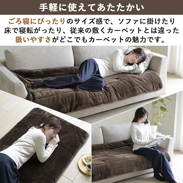 【ごろ寝にぴったり】ソファに掛けたり、床で寝転がったり、従来の敷くカーペットとは違った扱いやすさが魅力のどこでもカーペット。ごろ寝にぴったりのサイズ感で、裏面にはすべり止め加工が施されているので、床に敷いても滑りにくくなっています。
