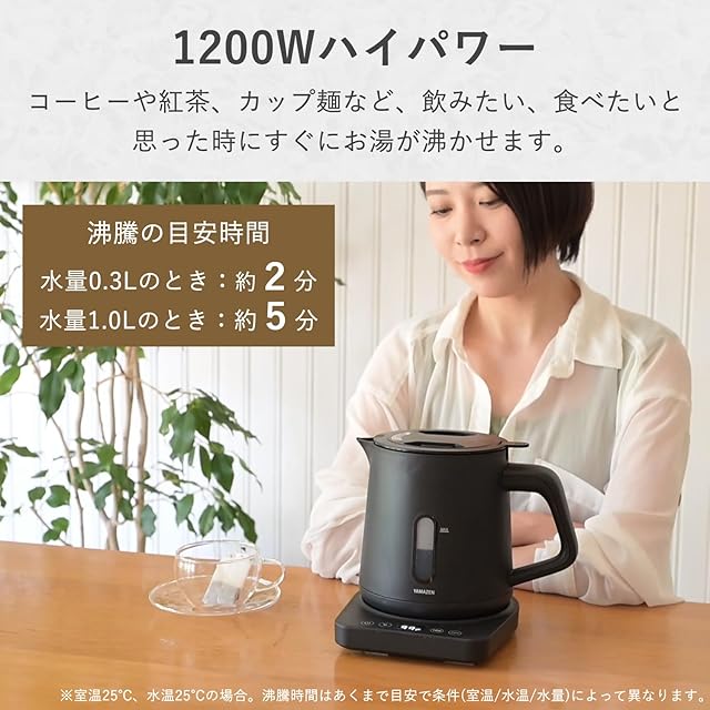 【1200Wハイパワー】1200Wのハイパワーで満水時(1L)でも約5分でお湯が沸かせ、コーヒーや紅茶など、飲みたいと思ったときにすぐお湯を沸かしてくれます。容量も1Lと大容量なので、家族みんなでのティータイムなどにも役立ちます。※沸騰時間は目安で、条件(室温・水温等)によって異なります。