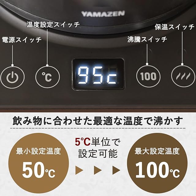 【温度調節】50℃~100℃を5℃単位で温度調整が可能です。飲み物に合わせた温度でお湯を沸かすことができ、無駄な温めすぎを防ぐので、省エネにも繋がります。沸騰スイッチを押せばワンタッチでの沸騰も可能です。
