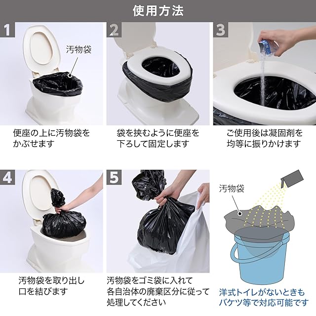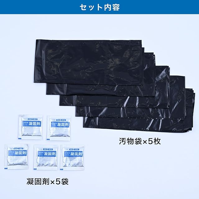 ●セット内容 : 凝固剤(アルミ包装)×5袋(10g)、汚物袋(黒)×5枚(約650×500mm)●材質 : 凝固剤/高分子ポリマー、汚物袋/ポリエチレン