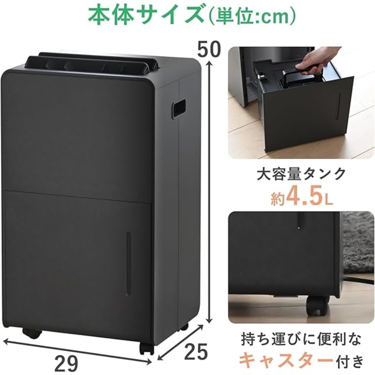 【除湿機能】▪除湿面積の目安:木造6畳/プレハブ10畳/鉄筋13畳(50Hz)、木造7畳/プレハブ11畳/鉄筋14畳(60Hz) ▪タンク容量:約4.5L ▪除湿方法:コンプレッサー式 ▪定格除湿能力:5.0L/日(50Hz)、6.0L/日(60Hz)