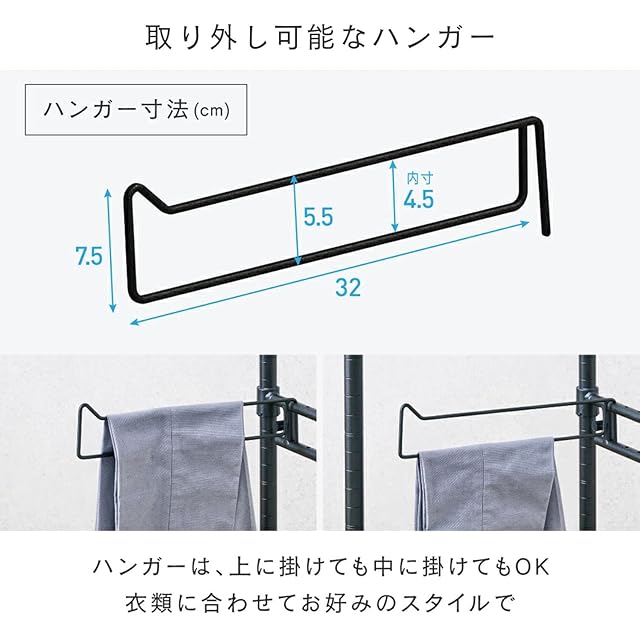 ハンガーが個別に左右にスイングすることで、目的の洋服が探しやすく、またハンガー部は取り外しができるため出し入れが簡単。