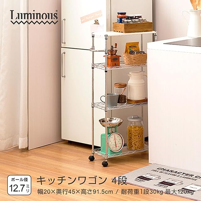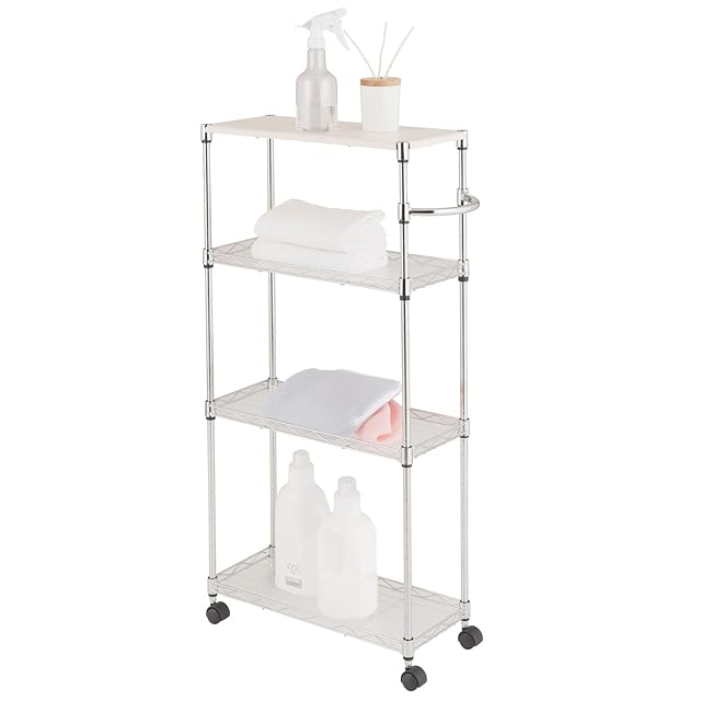ドウシシャ ワゴン キッチンワゴン ランドリー収納 幅20cm 4段 スリム 隙間収納 耐荷重120kg 幅20×奥行45×高さ91.5cm EP452090-4 木製天板 作業台 白 ホワイト ハンドルとキャスター付きで移動らくらく 専用シート付き 可動棚 | emishop315
