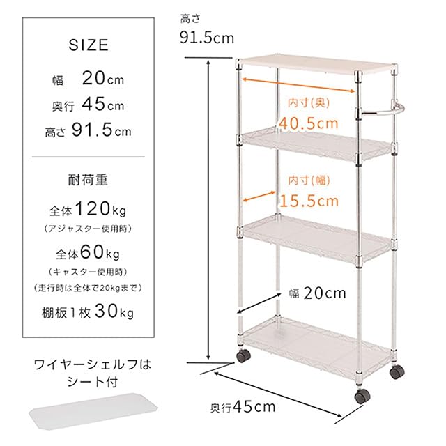 商品名:ドウシシャ ワゴン キッチンワゴン ランドリー収納 幅20cm 4段 スリム 隙間収納 耐荷重120kg 幅20×奥行45×高さ91.5cm EP452090-4 木製天板 作業台 白 ホワイト ハンドルとキャスター付きで移動らくらく 専用シート付き 可動棚
