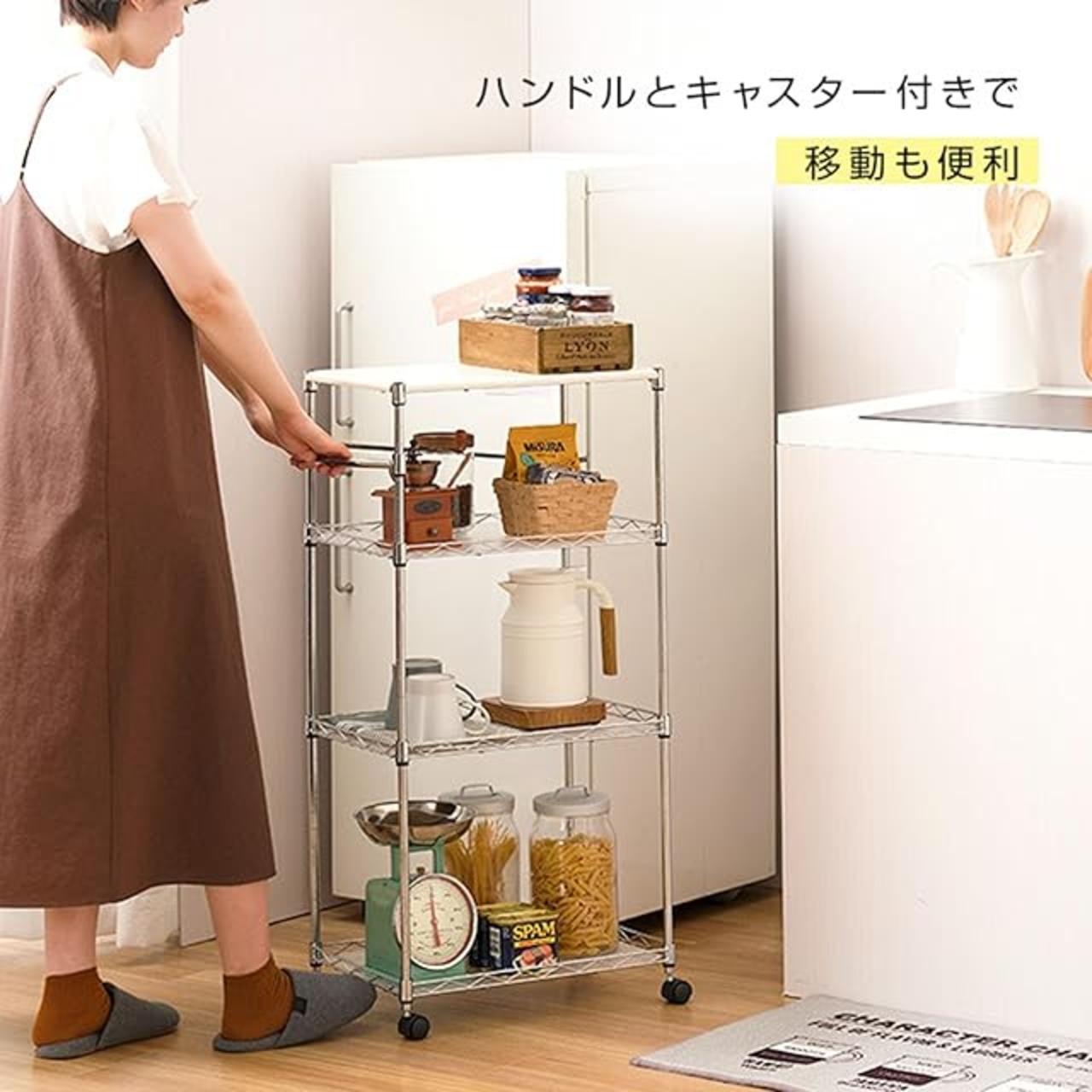商品名:ドウシシャ ワゴン キッチンワゴン ランドリー収納 幅30cm 4段 スリム 隙間収納 耐荷重120kg 幅30×奥行45×高さ91.5cm EP453090-4 木製天板 作業台 白 ホワイト ハンドルとキャスター付きで移動らくらく 専用シート付き 可動棚