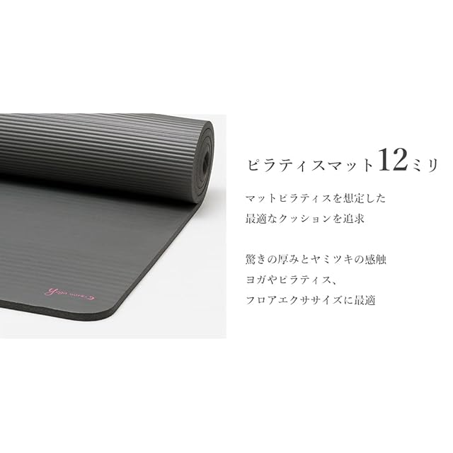 12mm厚のマシュマロタッチで、ピラティスはもちろん「おうちヨガ」にも最適!もっちりふわっとソフトな触感でからだをしっかりサポートする12mm厚。表面はスムース仕上げでグリップせず、裏面は丸めて保管するときにシワが付きにくい「なみなみ」加工済みです。 マットピラティスでの静止ポーズやローリングポーズで体重を吸収し身体への負担を軽減することを目的に開発されたマットです。 腹筋、背筋などのフロアストレッチ、また座位や横になるポーズが中心のヨーガにも最適です。 ●マットピラティスで必要なクッションを考えたら12mmでした マットピラティスで体を心地よくサポートするためには10mm程度の厚みが必要でした。これまでヨガワークスで展開してきたピラティスマットは6mm厚の PVC素材。同素材で10mm厚にすると重量が3kgを超えてしまい扱い難いマットになってしまいます。 そこで、新たにNBR(ニトリルゴム)素材のピラティスマットをつくりました。厚みは、クッション性をさらに重視した12mm。ソフトでしなやかな使い心地はマットピラティス、その他のフロアエクササイズに最適です。 また、海外製品では10mmマットなども珍しくないのですが、幅が70cm程度と広いものが大きく、日本でのレッスン時には、他の人よりも広い場所が必要となる為、注意が必要です。通常のヨガマットと同じ幅の61cmである事も大きなポイントです★ ●シワという問題を解決するピラティスマット ソフトで使い心地がよいNBR素材ですが、表面が繊細で、丸めたときにシワがつきやすいという欠点がありました。このピラティスマット12mmは、丸めたときのシワを防止するために、裏に「なみなみ」のデザインを採用。マットを丸めても裏がシワにならないようなプロダクトデザインになっています。 ●NBRという素材は、直射日光や蛍光灯の光により変色しやすい素材です。商品の保管は、直射日光や強い蛍光灯の光があたらない場所、また高温多湿な場所も避けていただくことをおすすめします。 NBRは、ニトリルゴムという素材です。 各種アレルギーのある場合は、ご使用をお避けいただくか、専門医にご相談いただくことをおすすめします。 健康に影響を及ぼす可能性のある「DEHP」は含んでいません。また、その他の注意事項は開封前、パッケージにてご確認の上ご使用ください。併せて 商品のお手入れ方法 もご確認ください。 ●マットをおろしたとき、なんとなく手元がヌルヌルと滑る感覚がある場合がございます。(イメージで言えばハンドクリームを塗ったような感覚です。)これは素材の乾燥や素材同士の張り付きを防ぐ為のコーティングが原因となります。 使っていくうちに次第にヌルつきは取れますが、気になる場合はマットをおろす時、固くしぼったタオルや雑巾でマットの表面を拭き、その後乾拭きして軽く日陰干しをすることをおすすめします。(素材を痛める可能性がある為、優しく拭いて下さい。) ●ヨガマット単体の商品です。※ケースは付属しておりません