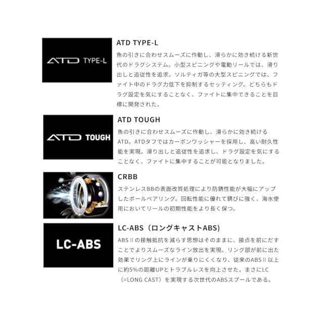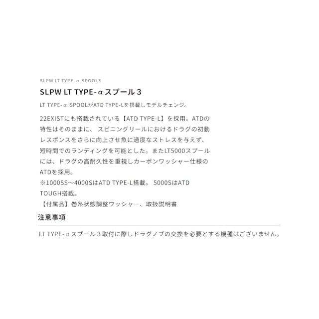 モデル【SLPW LT TYPE-α スプール3】……スピニングリールにおけるドラグの初動レスポンスをさらに向上させ、魚に過度なストレスを与えず、短時間でのランディングを可能とした「ATD TYPE-L」搭載モデル。