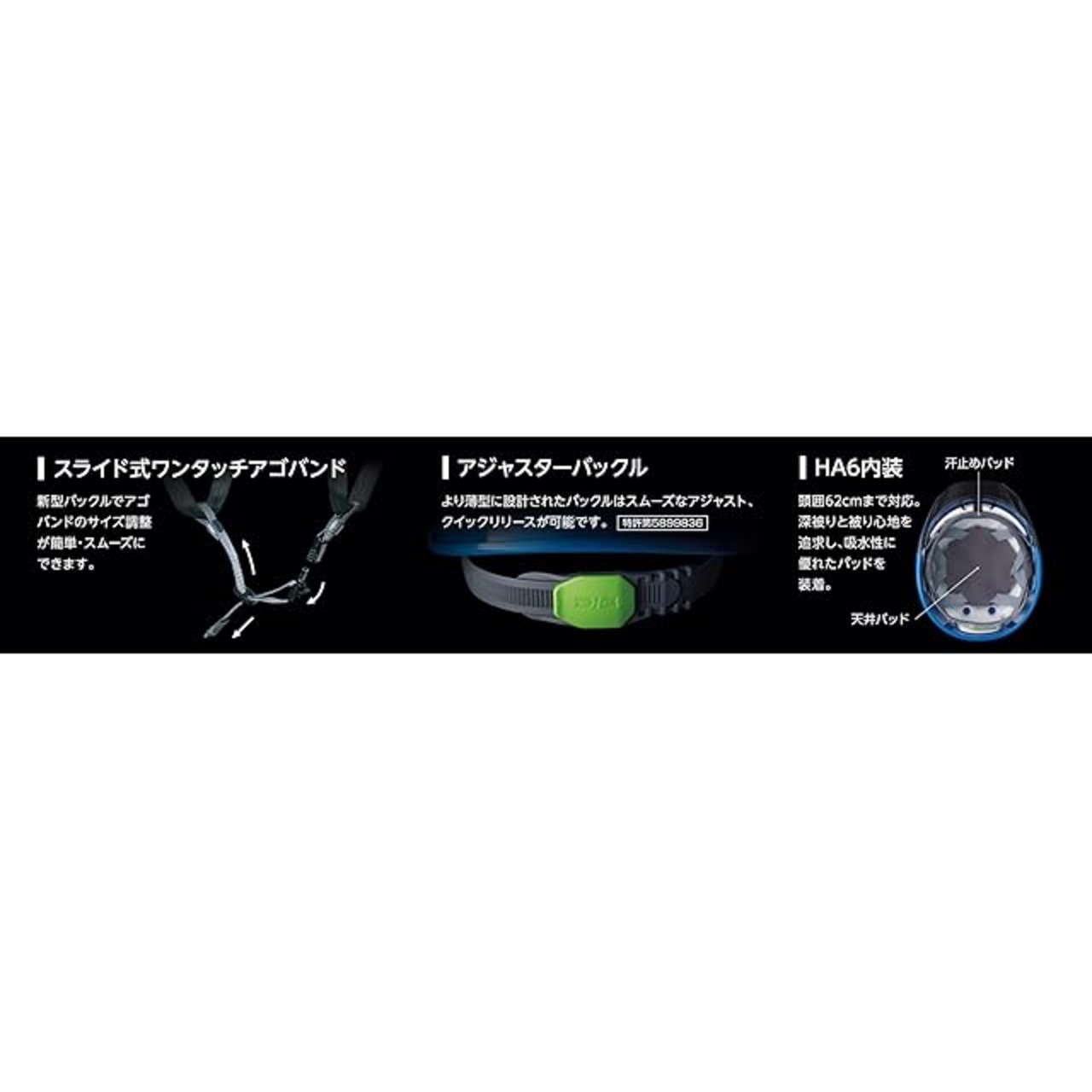 頭囲目安:54cm~62cm、適用内装:HA6内装、適用ライナー:A11ライナー(S-1シールド付)、耳ヒモ:E1耳ヒモ、アゴヒモ:スライド式ワンタッチアゴバンド