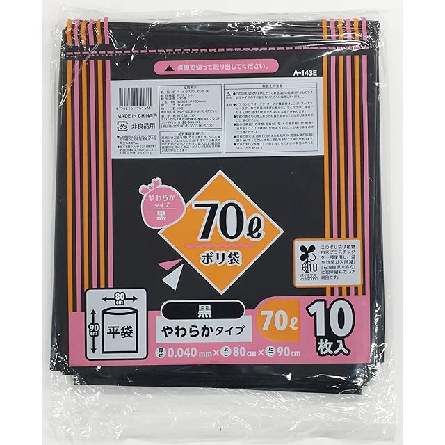 商品名:コア バイオマス 10% 配合 ゴミ袋 黒 70L 縦90cm×横80cm×厚み0.04mm 手触り やわらかタイプ ポリ袋 10枚入 A-143E