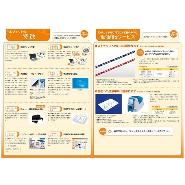 社員証を社内で即座に発行。IDジェットはパソコンとインクジェットプリンタがあれば社員証が作成できます。 IDジェットパッケージはソフトウェアCD-ROMと貼付台のセット。 印刷シートには強粘着の標準シート、弱粘着の再剥離シートをご用意。社員証券面を保護する保護シートパックに、台紙となるプラスチックカードもラインアップ。