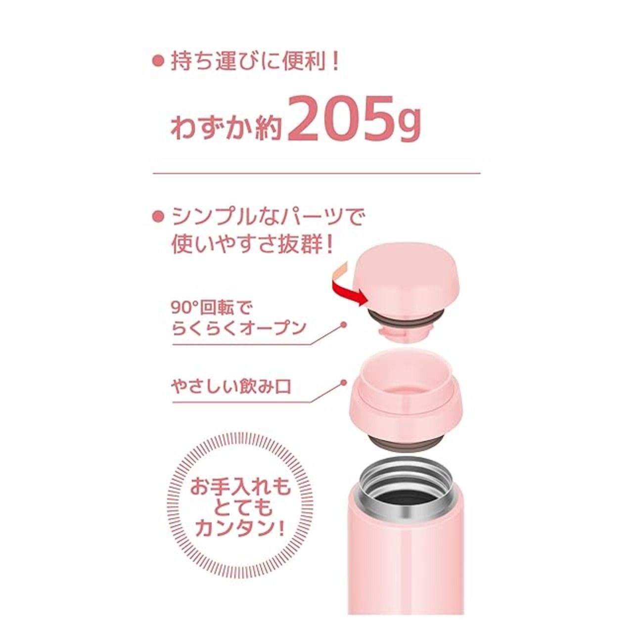 サイズ(約):幅6.5×奥行6.5×高さ21.5cm、本体重量(約):200g、容量:500ml