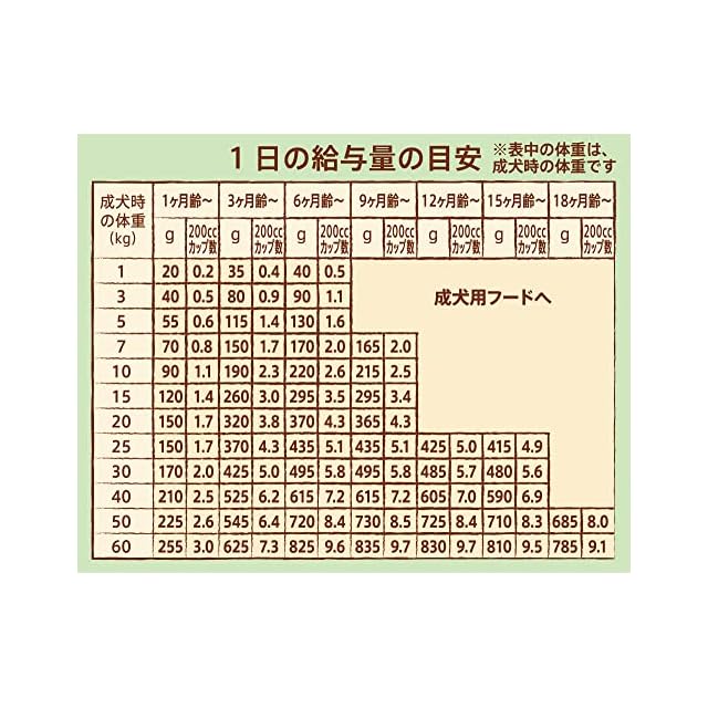 本品は、良質なタンパク質と脂質を調整し、子犬の健康な発育のために栄養バランスに配慮しています。また、ペットフード公正取引協議会の定める分析試験の結果、総合栄養食の基準を満たすことが証明されています。AAFCO(米国飼料検査官協会)規定の分析試験により、バランスの良い総合栄養食であることが証明されています。