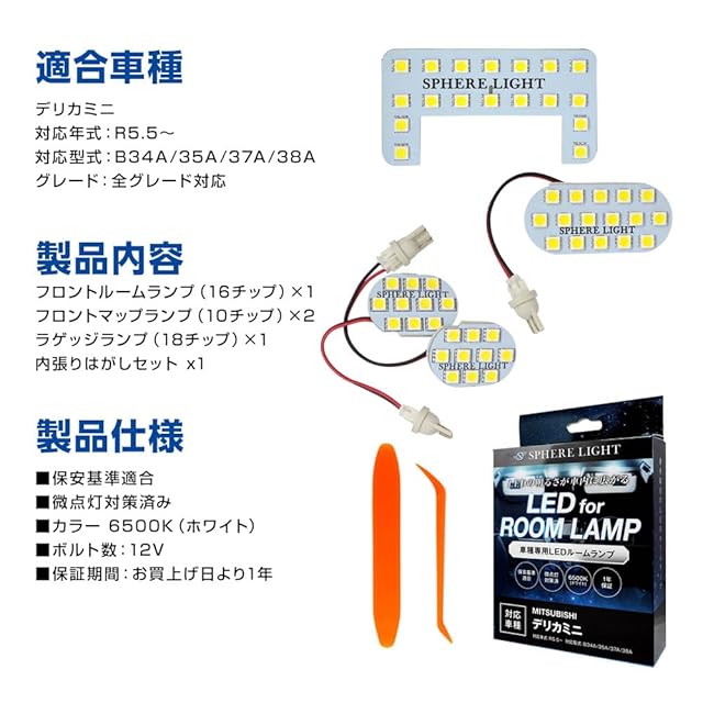 商品名:スフィアライト デリカミニ LED ルームランプ セット ホワイト B34A B35A B37A B38A 専用設計 室内灯 取付 簡単 微点灯 点滅 対策 SPHERELIGHT SLRM-60