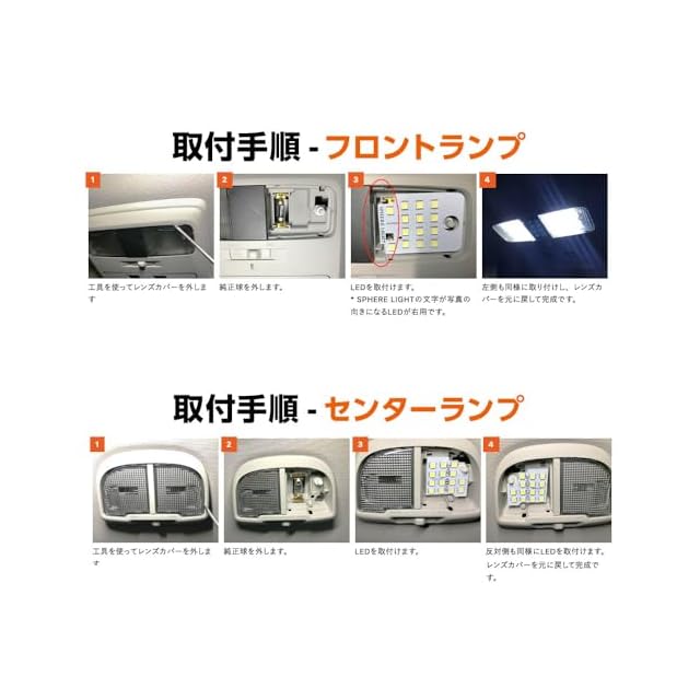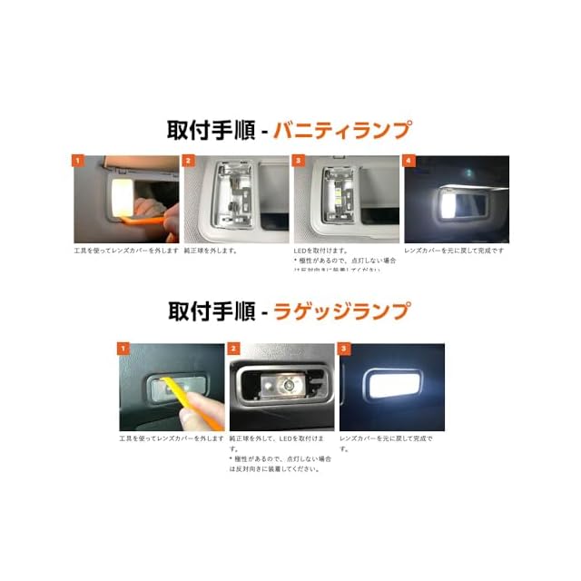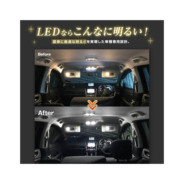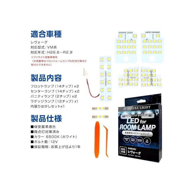 【セット内容】フロントランプ(14チップ)x2、センターランプ(14チップ)x2、バニティランプ(2チップ)x2、ラゲッジランプ(12チップ)x1、内張りはがしセットx1 ※アイサイト搭載車専用(非搭載車はフロントルームランプの形状が異なり取付けできません)