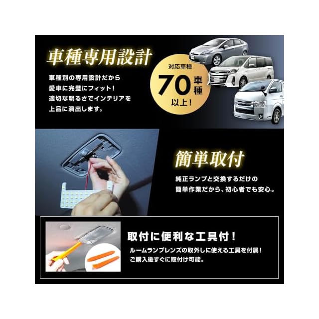 【専用工具付きで簡単交換】車体側のルームランプレンズを取り外すための専用工具(内張り剥がし)が付属しているため、取り外しづらいランプレンズも簡単に取ることができ、純正ランプと交換するだけの楽々交換。作業時間も短縮し、LED初心者さんをしっかりサポートします。