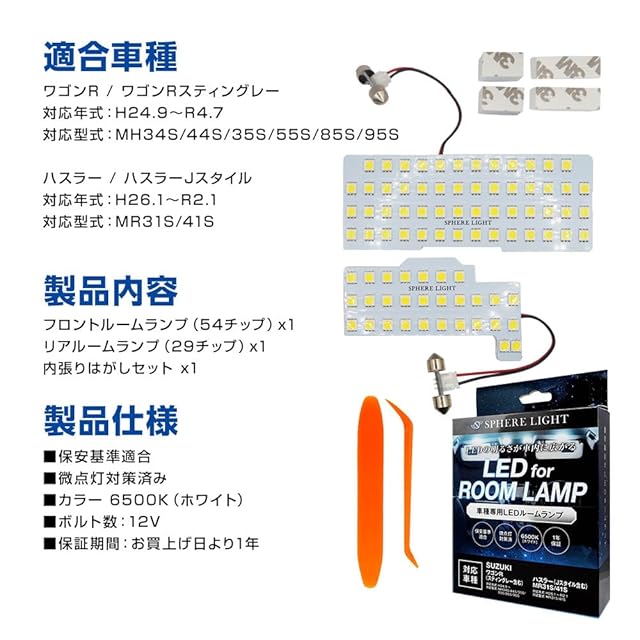 セット内容:フロントルームランプ(54チップ)×1、リアルームランプ(29チップ)×1、内張りはがしセット ×1