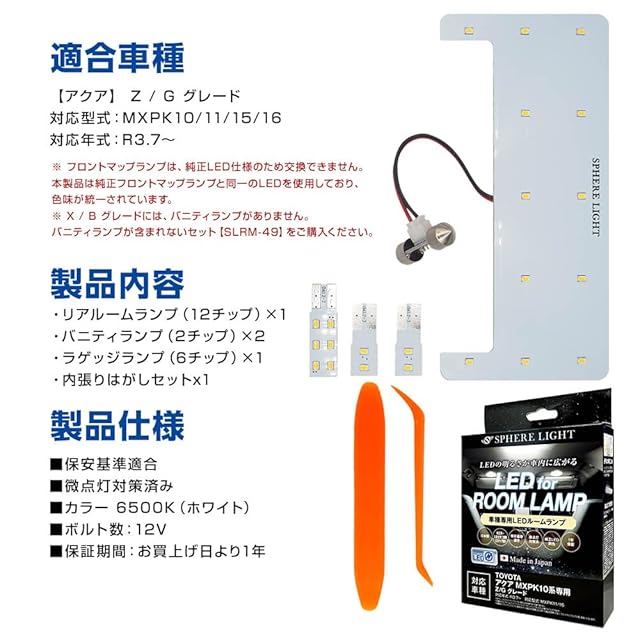 セット内容:リアルームランプ(12チップ)×1、バニティランプ(2チップ)×2、ラゲッジランプ(6チップ)×1、内張りはがしセット×1