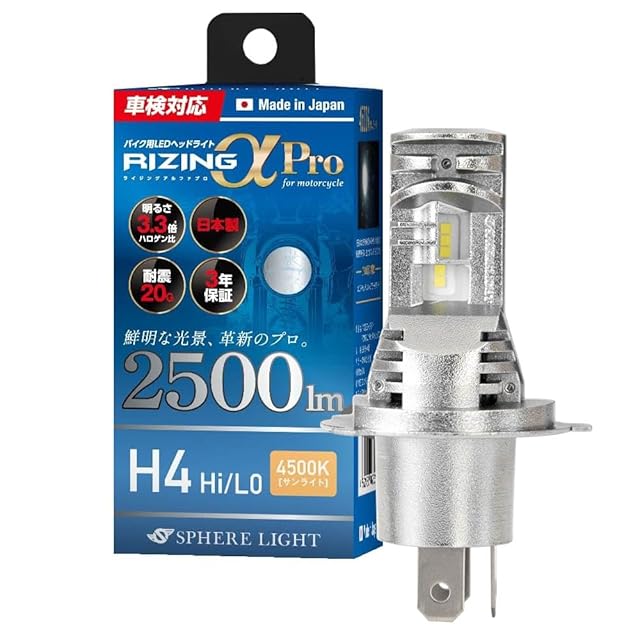 スフィアライト バイク RIZINGα Pro H4 Hi/Lo LED ヘッドライト 4500K サンライト 12V 2500lm 車検対応 日本製 ファンレス ポン付け バルブ 耐震20G 二輪 ライジングアルファ SPHERELIGHT SLRPBH4045 | emishop315