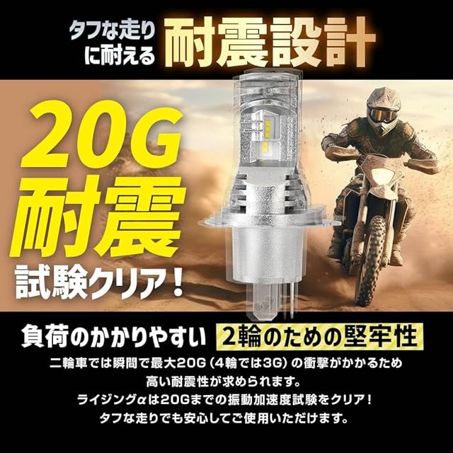 【製品仕様】商品名:バイク用RIZINGα Pro(ライジングアルファプロ)、形状:H4 Hi/Lo、明るさ:5000lm、カラー:4500K(サンライト)、対応電圧:DC12V、消費電力:24W、入り数:1本、:お買い上げより3年間
