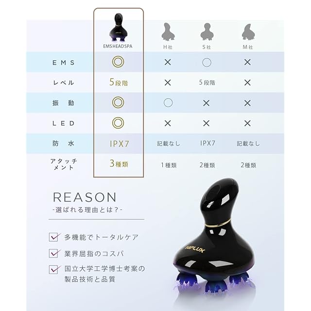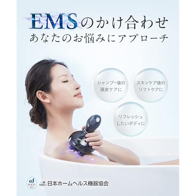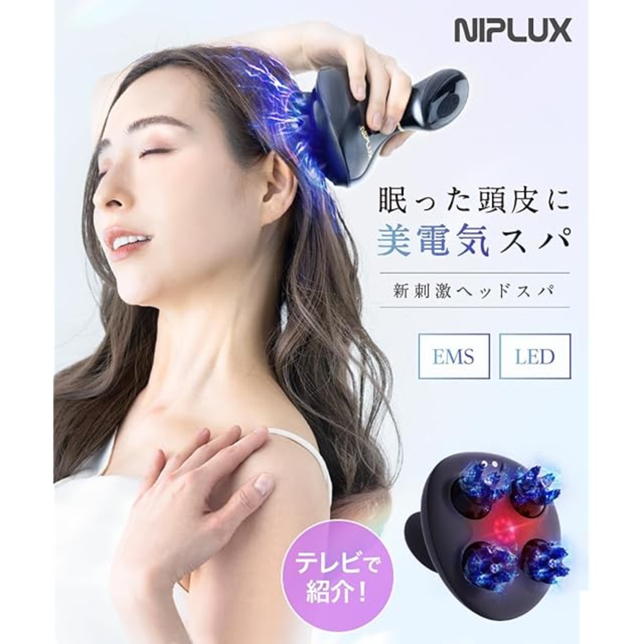【EMS機能を追加】既存のNIPLUX HEAD SPAの機能をそのままに、EMSの機能を追加してリニューアル!EMSの強さは5段階。NIPLUX独自のEMS波形パルス「DBN Technology」を搭載。繊細かつ心地よい低周波を構築。揉みだけではカバーしきれない筋肉を刺激して、頭皮と表情筋にアプローチします。また、EMSなしでのご使用も可能です。EMSに振動機能を加えることによって、頭皮の毛穴汚れを浮かし、心地よく叩いて落とします。1分間に約8800回の振動を行い、シャンプーしながらご使用いただくことで、手だけでは落ちにくい汚れもスッキリ洗浄。