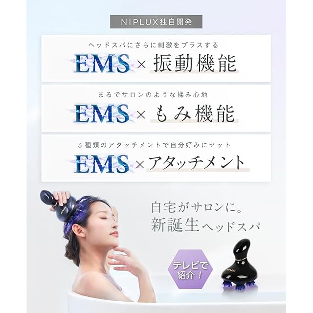 既存のNIPLUX HEAD SPAの機能をそのままに、EMSの機能を追加してリニューアル!EMSの強さは5段階。NIPLUX独自のEMS波形パルス「DBN Technology」を搭載。繊細かつ心地よい低周波を構築。揉みだけではカバーしきれない筋肉を刺激して、頭皮と表情筋にアプローチします。また、EMSなしでのご使用も可能です。EMSに振動機能を加えることによって、頭皮の毛穴汚れを浮かし、心地よく叩いて落とします。1分間に約8800回の振動を行い、シャンプーしながらご使用いただくことで、手だけでは落ちにくい汚れもスッキリ洗浄。