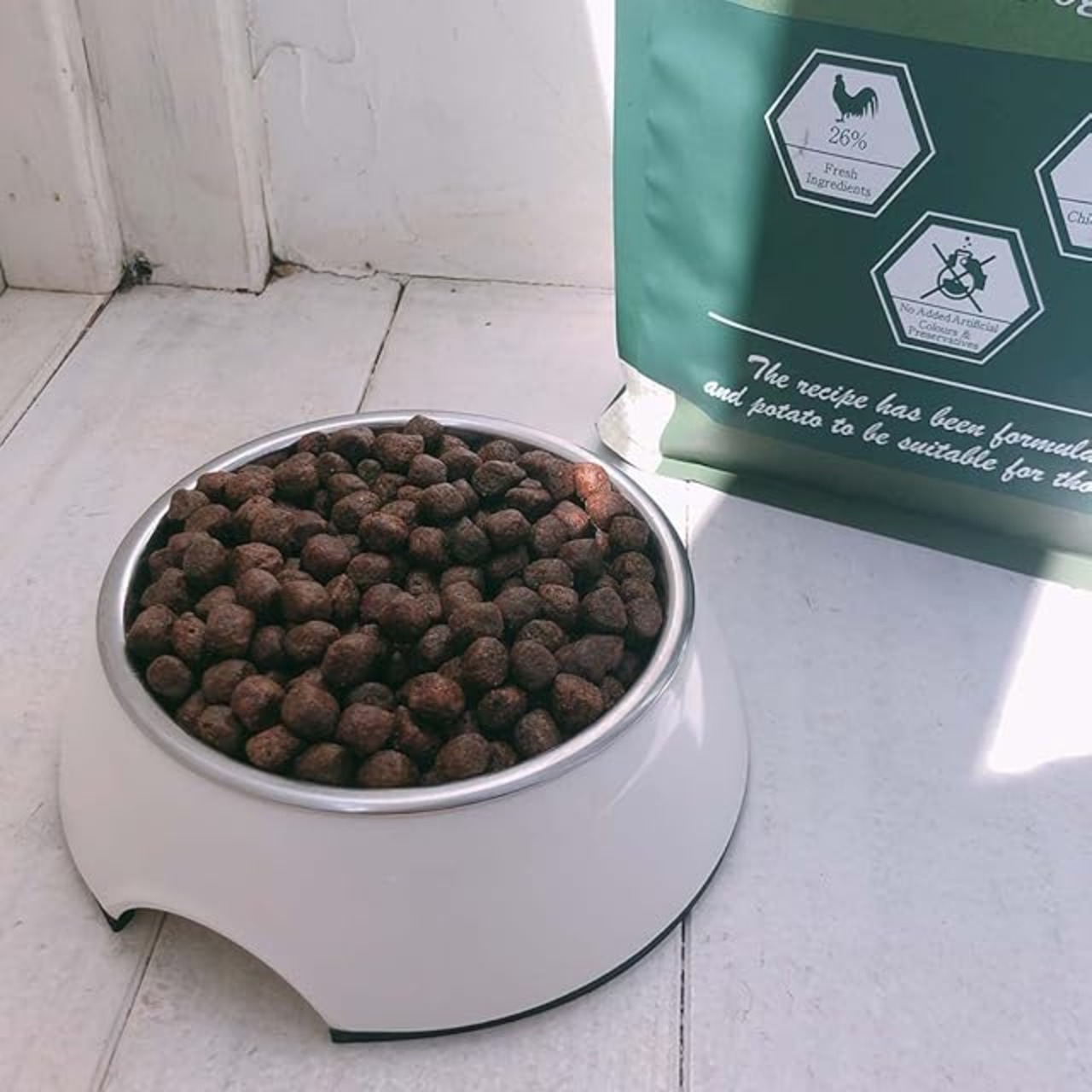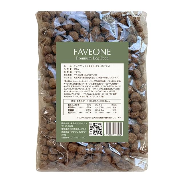 【FAVEONE 】 フェイヴワンは愛犬を思う全てのオーナー様、そして、ワンちゃんに寄り添うフードとなっております。健康と食いつきを両立させるべく、グレインフリー・ヒューマングレードの素材に拘って作り上げました。 商品種類 ドッグフード 対象犬種 小型犬〜大型犬 原産国 イギリス 原材料 チキン、ターキーとサーモン 60%(鮮度の高いチキン20%、乾燥チキン14%、 鮮度の高いターキー7%、鮮度の高いサーモン7%、乾燥ターキー7%、乾燥サーモン3%、チキンストック 2%)、サツマイモ(22%)、ジャガイモ、アマニ、オメガ3サプリメント、ビートパルプ、ミネラル、ビタミン、ニンジン(0.2%)、エンドウ豆(0.07%)、グルコサミン( 1キロ当たり170mg)、メチルスルフォニルメタン(1キロ当たり170mg)、コンドロイチン硫酸(1キロ当たり125mg)、野菜ストック、ヌクレオチド、フラクトオリゴ糖(1キロ当たり96mg)、マンナンオリゴ糖(1キロ当たり24mg) 成分(エネルギー100gあたり約384kcal) 粗タンパク質 29% 粗脂肪 15% 粗繊維 2.5% 粗灰分 7% 水分 8% 可溶性無窒素物 38.5% 代謝性エネルギー 384kcal/100g オメガ6 2.6% オメガ3 1.6% カルシウム 1.2% リン 1%
