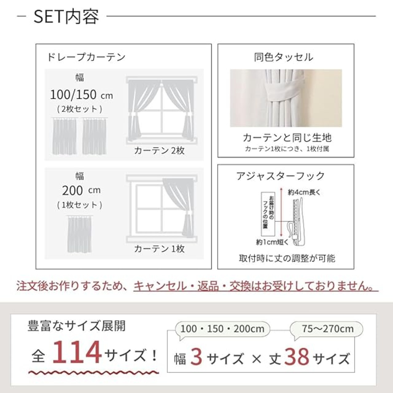 ●114サイズ展開/幅:100/150/200cm/丈:75~270cmの間で5cm刻み/※ただし、丈170~200cmの間は、丈178・185・192です。丈175、195cmはご用意しておりません/※幅100・150cmは2枚組、幅200cmは1枚組/※サイズ表記は1枚あたりのサイズです