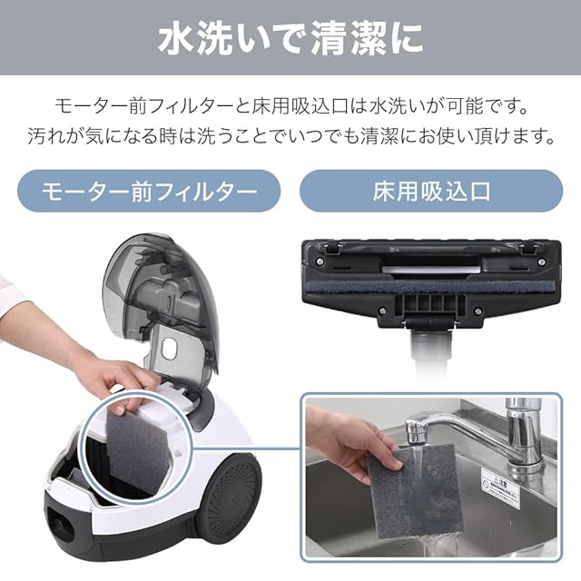 【水洗いで清潔に】 床用吸込口とモーター前フィルターは水洗いが可能です。 汚れが気になる時は洗うことでいつでも清潔にお使い頂けます。