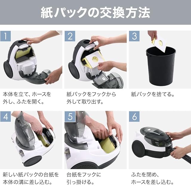 【ゴミ捨てやお手入れが簡単な紙パック式】 掃除機本体から紙パックを取り外すだけでゴミの処分が完結するので、 手が汚れてしまったりホコリが舞ったりすることはほとんどありません。 スリムな軽量設計で使いやすい掃除機です。