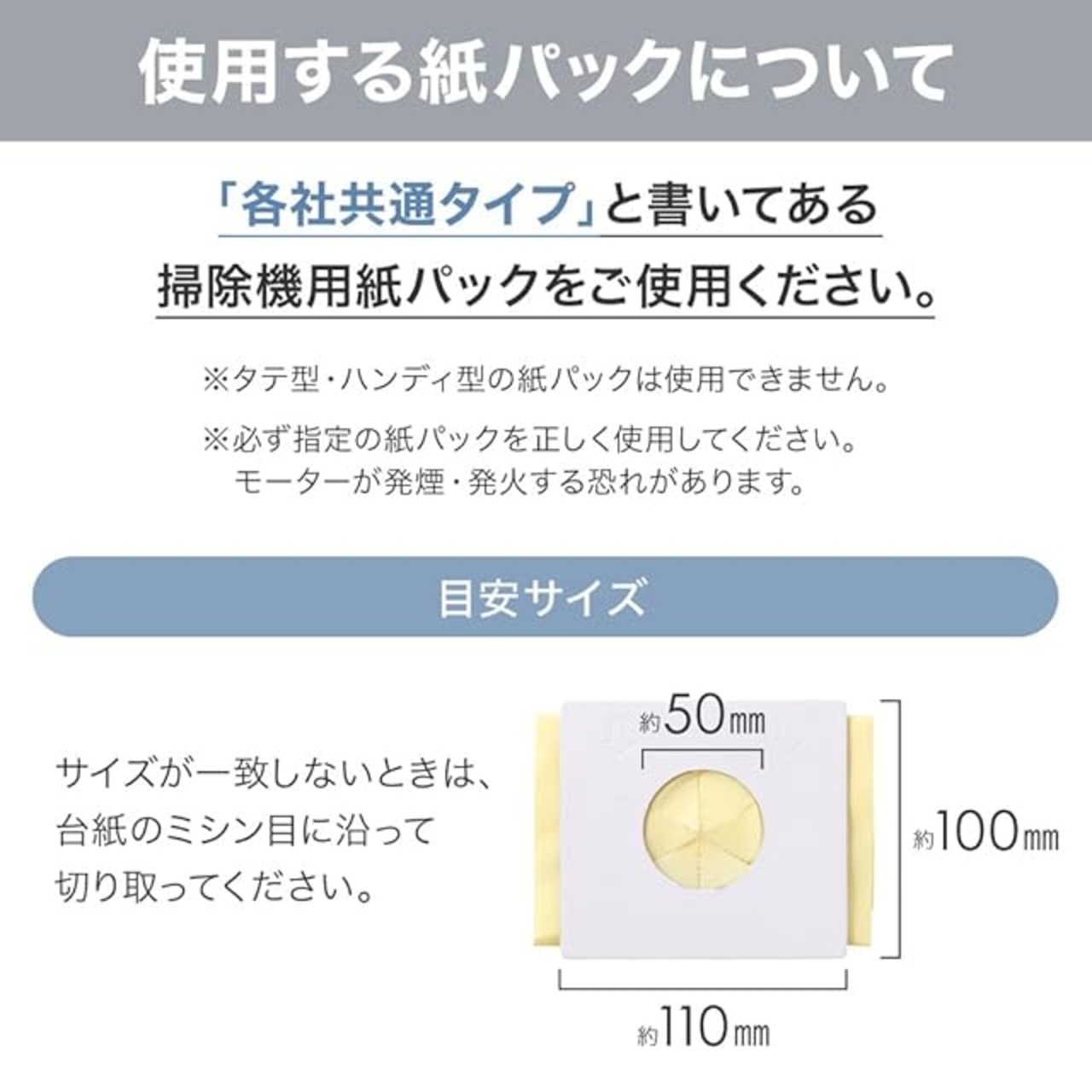 【紙パックの交換】 吸引力が弱いと感じた時は紙パックの交換をおすすめします。 ※注意※ 交換の前に手元コントロールスイッチを「切」に合わせ、電源プラグを抜いてください。 ~長くお使いいただくためのお願い~ 破れた紙パックの使用や繰り返しの使用はしないでください。故障の原因となります。【使用する紙パック】 各社共通タイプと書いてある掃除機用紙パックをご使用ください。 ※タテ型・ハンディ―型の紙パックは使用できません。 ※必ず指定の紙パックを正しく使用してください。 目安サイズ:約110×100mm(穴の直径:約50mm) ※サイズが一致しないときは、図のように台紙のミシン目に沿って切り取ってください。