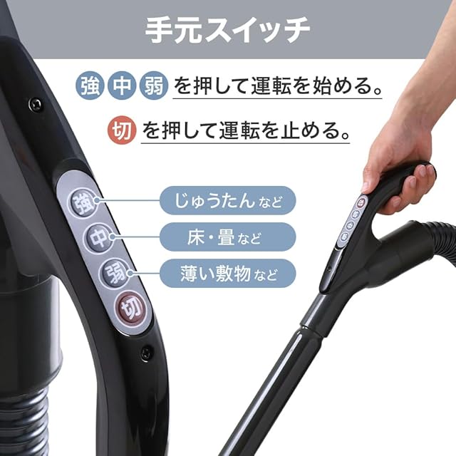 <b>【ゴミ捨てやお手入れが簡単な紙パック式】</b><br> 掃除機本体から紙パックを取り外すだけでゴミの処分が完結するので、<br> 手が汚れてしまったりホコリが舞ったりすることはほとんどありません。<br> スリムな軽量設計で使いやすい掃除機です。<br> <br> <b>【水洗いで清潔に】</b><br> 床用吸込口とモーター前フィルターは水洗いが可能です。<br> 汚れが気になる時は洗うことでいつでも清潔にお使い頂けます。<br> <br> <b>【すき間用吸込口】</b><br> 階段のすみやお部屋の隙間、サッシの溝など細かい場所のお掃除に便利なすき間用吸込口が付属しています。<br> パイプホルダーに装着可能です。<br> <b>※本体のすき間ポケットに収納されております</b><br><br> <br> <b>【紙パックの交換】</b><br> 吸引力が弱いと感じた時は紙パックの交換をおすすめします。<br> ※注意※<br> 交換の前に手元コントロールスイッチを「切」に合わせ、電源プラグを抜いてください。<br> ~長くお使いいただくためのお願い~<br> 破れた紙パックの使用や繰り返しの使用はしないでください。故障の原因となります。<br> <br> <b>【使用する紙パック】</b><br> 各社共通タイプと書いてある掃除機用紙パックをご使用ください。<br> ※タテ型・ハンディ―型の紙パックは使用できません。<br> ※必ず指定の紙パックを正しく使用してください。<br> 目安サイズ:約110×100mm(穴の直径:約50mm)<br> ※サイズが一致しないときは、図のように台紙のミシン目に沿って切り取ってください。<br> <br> <br> <b>【商品詳細】</b><br> 本体寸法(約):長さ295mm×幅242mm×高さ:222mm<br> 重量(約):4.4kg(ホース、伸縮パイプ1本、ホース1本、すき間用吸込口含む)<br> 電源:AC100V 50-60Hz共用<br> 消費電力:1000W~約280W<br> 吸込仕事率:300W~約80W<br> コードの長さ:約5m<br> 運転音:69dB~約55dB<br> 集じん容量:1.4L<br> 付属品:床用吸込口1個、伸縮パイプ1本、ホース1本、すき間用吸込口1個、紙パック1枚(本体に装着)、説明書 兼 書(国内メーカー1年)※※すき間用吸込口は本体の上部に収納されています※※