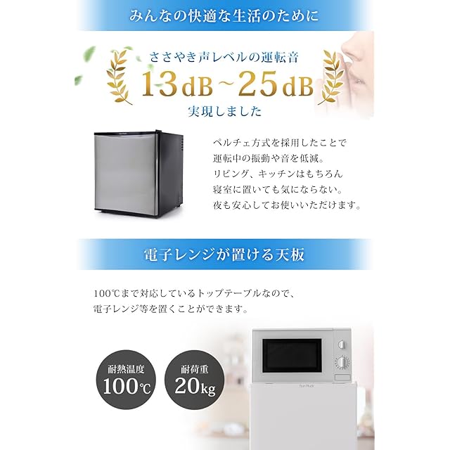 【静音・低振動のペルチェ方式】ペルチェ式とはペルチェ素子の熱移動利用した冷却方式。駆動部分が少なく静音性に優れ、コンパクトで庫内スペースを広く取れるのが特長です。※庫内冷気循環、放熱にファンを利用していますので、完全な無音運転はできません。