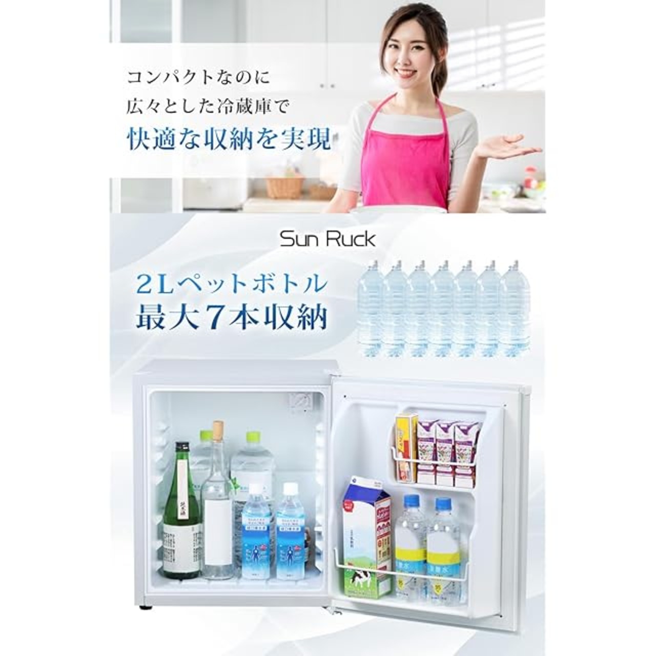 【48Lの収納力】 製氷機が付いていない分、庫内スペースが広いので、小物から2Lペットボトルまでたっぷり収納可能です。 ・1.5~2Lペットボトル/庫内(庫内の棚を外した状態で):6本、ドアポケット:1本・500mlペットボトル/庫内(庫内の棚を外した状態で):8本、ドアポケット:4本