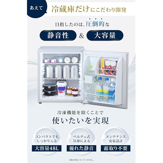 【48Lの収納力】 製氷機が付いていない分、庫内スペースが広いので、小物から2Lペットボトルまでたっぷり収納可能です。 ・1.5~2Lペットボトル/庫内(庫内の棚を外した状態で):6本、ドアポケット:1本・500mlペットボトル/庫内(庫内の棚を外した状態で):8本、ドアポケット:4本